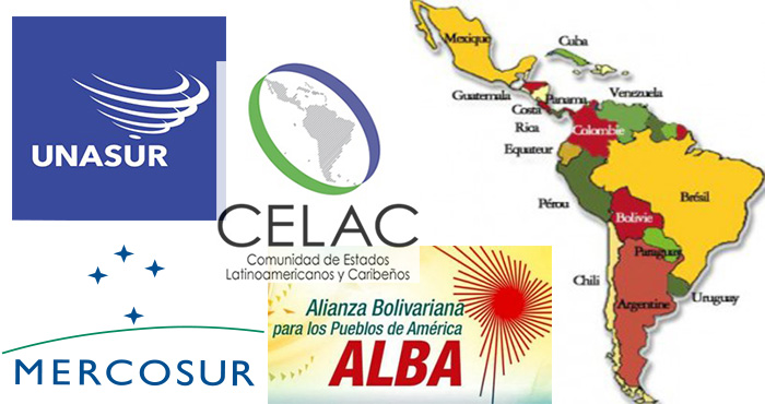 Con el retorno de gobiernos neoliberales en Brasil y Argentina las misiones propiamente latinoamericanas del Mercosur (Mercado Común del Sur), de CELAC (Comunidad de Estados Latinoamericanos y Caribeños) y de UNASUR Unión de Naciones Suramericanas) aparecen cuestionados en sus perspectivas de transformación de la región en un actor con voz propia en el contexto internacional. Una tendencia a la que se agrega el debilitamiento del ALBA (Alianza Bolivariana para los Pueblos de nuestra América), producto de la crisis venezolana por la caída internacional de los precios del petróleo. El proceso de integración propiamente latinoamericana que hasta hace un par de años era una realidad incuestionable, aparece más ambiguo con la ofensiva neoliberal en América Latina. Demos un vistazo a la situación de algunas instancias claves de la integración latinoamericana.