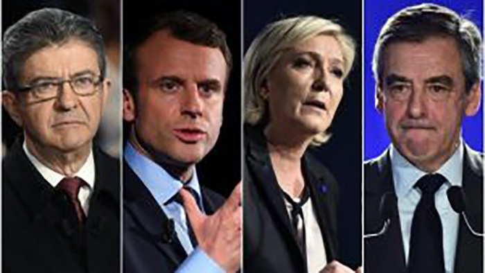 En Francia, de los 11 candidatos a la presidencia, sólo cuatro tienen posibilidades de ganar el 23 de abril y pasar a la segunda vuelta del 7 de mayo. El candidato oficial del partido socialista, Benoit Hamon, con apenas 9% en las encuestas, aparece excluido del grupo. De acuerdo a las encuestas, el centrista Emmanuel Macron tendría entre 24% y 22%; la ultraderechista Marine Le Pen tiene entre 23% y 22%; el derechista Francois Fillon entre 21% y 19,5% y el izquierdista candidato de la Francia Insumisa Jean-Luc Mélenchon entre 19,5 y 18%. Como los resultados se inscriben en el margen de error todo puede suceder. Para aumentar la tensión, recuérdese que las elecciones que se realizan bajo el Estado de Emergencia en vigor desde el 14 de noviembre de 2015.