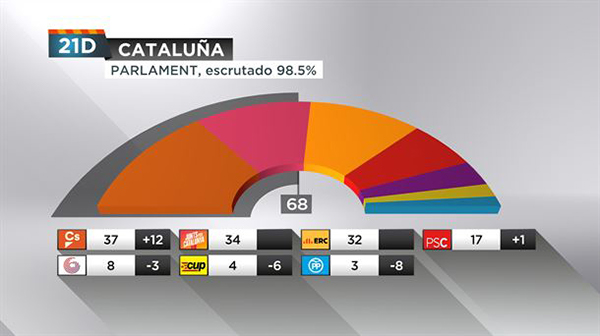 Los anti independentistas declarados obtienen 57 escaños, lejos de poder formar un gobierno mayoritario. El derechista Ciutadans alcanzó la primera mayoría obteniendo 37 escaños, (27,41%). Tenía sólo 25 diputados antes de la disolución de la generalitat por Madrid. Se esperaba que obtuviera muchos más votos. Contó con una enorme cobertura mediática que transformó a Inès Arrimadas, en superstar. La estrategia del voto útil catapultó a Ciutadans, transformando ese partido en la fuerza más votada.. Por su parte el Partido Socialista de Cataluña, aumentó en un diputado sus escaños. Pasó de 16 a 17 diputados (12,59%). El gran perdedor fue el Partido Popular de Mariano Rajoy. El PP perdió 8 diputados, pasando de 11 diputados a sólo 3 escaños (2,22). No obtuvo resultados la campaña que anunciaba una crisis económica en Cataluña.