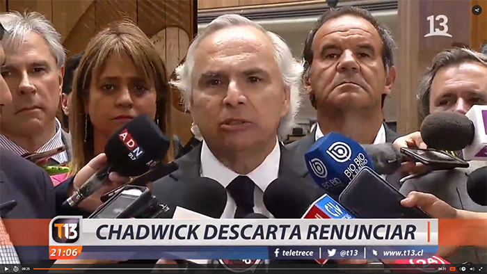 El asesinato del joven Mapuche Camilo Catrillanca desveló la crisis institucional de Carabineros: Se agregó a la impunidad, a los abusos policiales en la Araucanía y en el resto de Chile, al escándalo de la Operación Huracán, a los fraudes al fisco y las denuncias de corrupción. Luego de la forzada renuncia forzada del Director de Carabineros Hermes Soto, reemplazado por Mario Rozas; ahora es Andrés Chadwick, Ministro del Interior, primo del Presidente Piñera, quien arriesga una acusación constitucional por sus mentiras para encubrir el asesinato del comunero Mapuche.