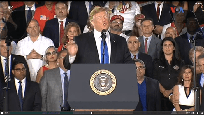 ¿Si todavía tiene dudas sobre quien dirige la ofensiva actual contra la revolución bolivariana? Escuche el discurso de Donald Trump ante la comunidad venezolana de Miami el 18 de febrero. El afirmó en Miami que “los días del socialismo en Venezuela están contados”. Trump amenazó, los miembros de la FNAB de perder todo, si no apoyan a Juan Guaidó y no dejan entrar la ayuda humanitaria a Venezuela. Una afirmación injerencista inaceptable. La retórica trumpista afirma esperar que Maduro abandone el poder, pero no descarta la intervención militar.