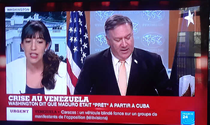 Como lo hace desde el 23 de enero, Washington fue el primero en apoyar la asonada golpista de Guaidó, extendiendo sus ataques a aliados de Venezuela. En CNN el ministro de relaciones exteriores de Donald Trump, Mike Pompeo, afirmó sin pestañear, que el presidente Nicolás Maduro, iba a escapar a Cuba, pero los rusos le convencieron en quedarse. Por su parte, en Twitter, el presidente estadounidense, Donald Trump, amenazó a cuba con un embargo total si seguía apoyando el gobierno bolivariano. De acuerdo al Comercio, John Bolton afirmó que varios miembros del gobierno de Nicolás Maduro habían prometido transferir el poder a Juan Guaidó. Entre ellos, el ministro de defensa Vladimir Padrino, Maikel Moreno, de la Corte Suprema y Hernández Dala de la Guardia Presidencial.