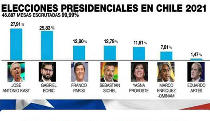 El 19 de diciembre competirán, por un lado, el ultraderechista José Antonio Kast, del nuevo referente ultraderechista, Frente Social Cristiano. Él obtuvo 27,91% de acuerdo al último cómputo del Servel. Por otro, Gabriel Boric, candidato del emergente bloque de izquierda Apruebo Dignidad, que obtuvo 25,83% de preferencias.