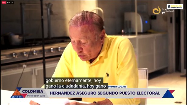 Hernández hizo una campaña populista en medios sociales presentándose como outsider contra la corrupción de los políticos.[4] En la segunda vuelta, aparece paradojalmente, a la vez, como un candidato antisistema y como el as en la manga de la oligarquía, para cerrarle el paso al Pacto Histórico. El derrotado derechista candidato, Fico Gutiérrez de Equipo Colombia y figuras claves del uribismo, le apoyan abiertamente.[5]