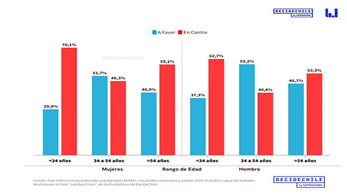 En definitiva, fueron los jóvenes, menores de 34 años, principalmente las mujeres (70%), quienes lideraron la victoria del voto “En contra” propinando una derrota aplastante e inapelable a la Constitución de las derechas. La millonaria campaña electoral y la alta figuración de los partidarios del “A favor” en medios de comunicación empresariales y redes sociales no consiguieron “vender” su proyecto constitucional. Las derechas no lograron mejor resultado en su intento de imponer como voto de urna la politización conservadora del “miedo a la inseguridad”. Tampoco surtió efecto el burdo slogan: “Boric vota En Contra, Chile vota A Favor” y otros intentos en transformar la elección en plebiscito contra el gobierno.