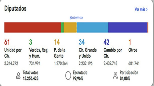 Por su parte la lista Unidad por Chile cuenta con 61 diputados y los Verdes, Regionalistas y Humanistas, completan tres, a ellos debe agregarse el diputado independiente fuera de pacto Carlos Bianchi de Magallanes. Con 65 diputados, el bloque oficialista, está lejos de la mayoría de 78 diputados: es el peor desempeño del sector desde el retorno de los gobiernos civiles en 1990.