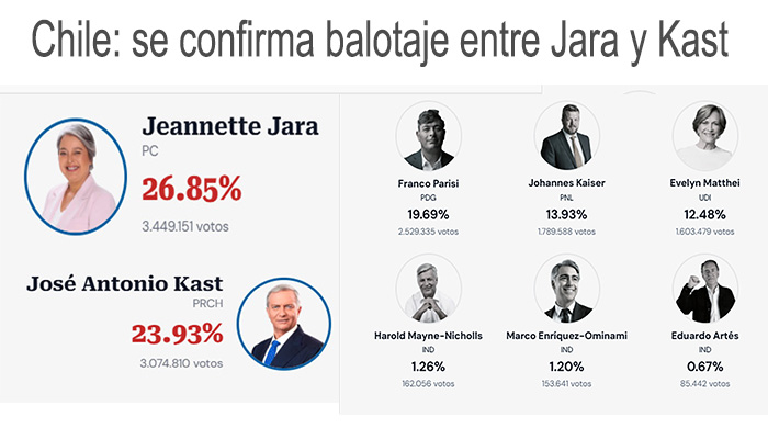 Los resultados indican que, tal como se esperaba, habrá balotaje por la presidencia de Chile, el 14 de diciembre próximo. Por un lado, la candidata de Jeannette Jara obtuvo 26,85% de los votos. Ella lidera la coalición Unidad Por Chile, formada por los partidos, Demócrata Cristiano (PDC), Por la Democracia (PPD), Socialista de Chile (PS), Comunista, Radical, Liberal y el Frente Amplio. Se trata del bloque más amplio de la centroizquierda, el progresismo y la izquierda, desde el retorno de gobiernos civiles en 1990.