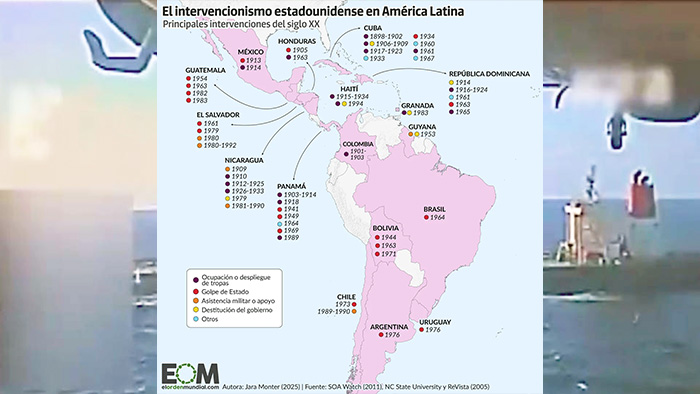 En América Latina, la intervención directa de la administración Trump, usando toda la fuerza militar del imperio, recuerda las décadas de golpes de Estado y de destrucción de la democracia por regímenes militares respaldados por EU durante el siglo XX, desde el primer golpe de Estado de la CIA contra Jacobo Arbenz en Guatemala, hasta la invasión de Panamá, pasando por el golpe de Estado contra Salvador Allende en Chile. Lo cierto es que en América Latina, el poder sin restricciones de Trump, la hegemonía del discurso imperante en torno a la democracia en sí en Latinoamérica, defendido desde los progresismos hasta varias derechas, que, aunque evita golpes de Estado ha sido reemplazado por golpes institucionales o el lawfare, basado en el Estado de Derecho desde los años 90.